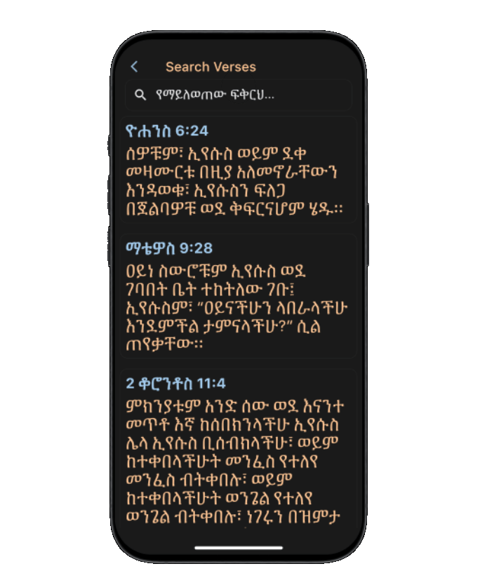 Explore the timeless wisdom, guidance, and inspiration of the Scripture in your native language for deeper understanding. Amharic (የድሮ ትርጉም እና አዲሱ መደበኛ ትርጉም), Afaan Oromo, Tigrigna, English and more to come.